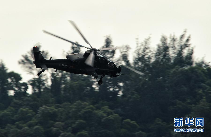 2012年11月11日,國產(chǎn)武直10武裝直升機在珠海三灶機場進行飛行訓(xùn)練。當(dāng)日,我國自主研制生產(chǎn)的武直10武裝直升機在珠海三灶機場進行了約20分鐘的適應(yīng)性飛行訓(xùn)練,做出倒飛、萊維斯曼機動、高速大角度俯沖、低空小半徑盤旋等動作,展現(xiàn)出其優(yōu)異性能,引來航展現(xiàn)場觀眾頻頻喝彩。楊光 攝 圖片來源:新華網(wǎng)