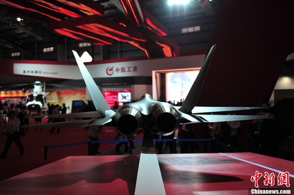 11月13日上午,第九屆中國國際航空航天博覽會在廣東珠海開幕,一架中國先進(jìn)戰(zhàn)斗機(jī)概念模型在中航工業(yè)展臺亮相,從外形上看,與前不久成功試飛的殲31相似,備受關(guān)注。中新社發(fā) 柯小軍 攝