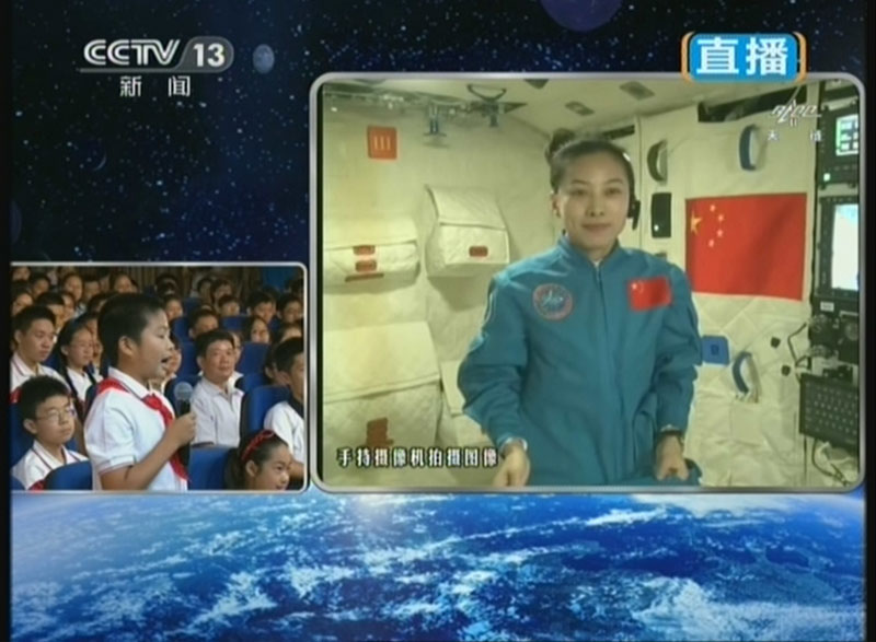 6月20日上午10時(shí)許,神舟十號(hào)航天員進(jìn)行中國(guó)首次太空授課,女航天員王亞平擔(dān)任主講,成為中國(guó)首位“太空教師”。圖為在北京人大附中地面互動(dòng)課堂聽(tīng)課的學(xué)生向“太空教師”提問(wèn)。(視頻截圖)