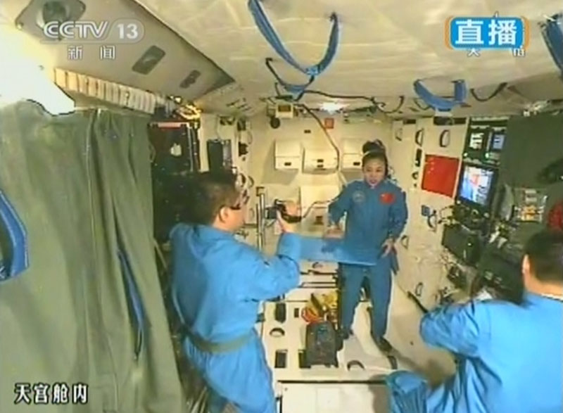 6月20日上午10時(shí)許,神舟十號(hào)航天員進(jìn)行中國(guó)首次太空授課,女航天員王亞平擔(dān)任主講,成為中國(guó)首位“太空教師”。(視頻截圖)