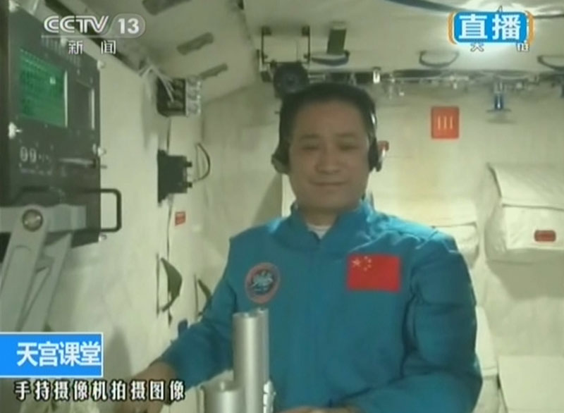 6月20日上午10時許,神舟十號航天員進(jìn)行中國首次太空授課,女航天員王亞平擔(dān)任主講,成為中國首位“太空教師”。圖為指令長聶海勝擔(dān)任助教。(視頻截圖)