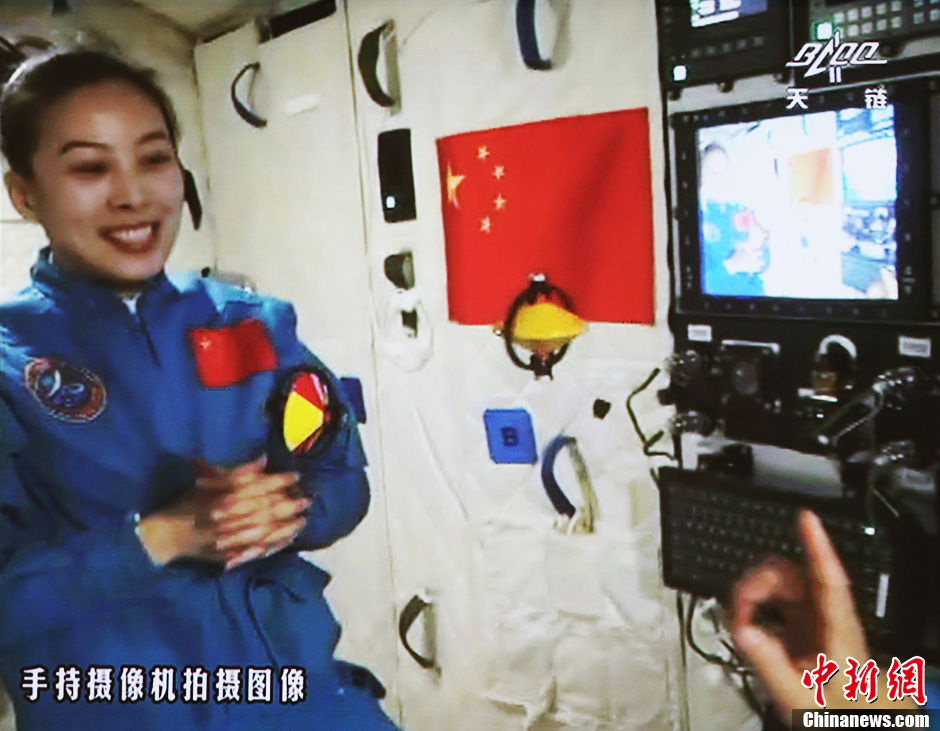 6月20日10時(shí)許,神舟十號(hào)航天員在天宮一號(hào)開展基礎(chǔ)物理實(shí)驗(yàn),為青少年進(jìn)行中國首次太空授課。圖為王亞平講授太空失重提供條件下的陀螺演示。中新社發(fā) 秦憲安 攝
