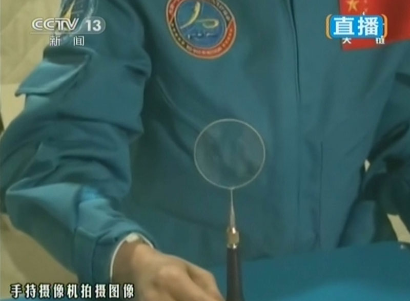 6月20日上午10時(shí)許,神舟十號(hào)航天員進(jìn)行中國(guó)首次太空授課,女航天員王亞平擔(dān)任主講,成為中國(guó)首位“太空教師”。圖為王亞平進(jìn)行“水膜”演示。(視頻截圖)