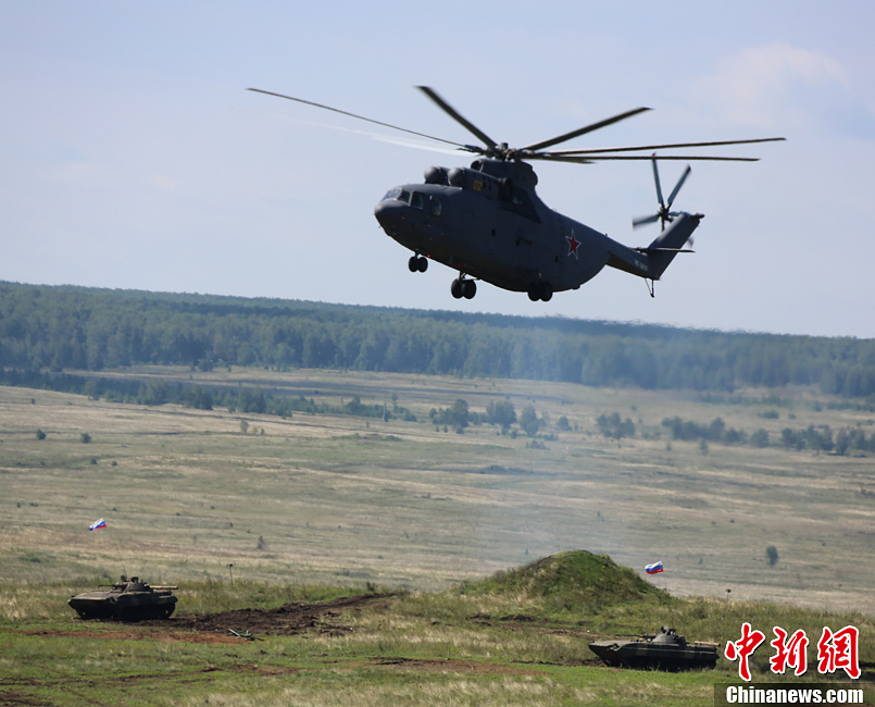8月12日,“和平使命-2013”聯(lián)合反恐軍演中俄兩軍參演部隊(duì)在切巴爾庫(kù)爾合同訓(xùn)練場(chǎng)舉行全員全要素實(shí)兵協(xié)同訓(xùn)練。雙方共出動(dòng)官兵近900人,坦克、步戰(zhàn)車、直升機(jī)等武器裝備約130臺(tái),雙方導(dǎo)演部總導(dǎo)演——俄中部軍區(qū)司令員波格諾夫斯基和沈陽(yáng)軍區(qū)副司令員石香元,共同到演習(xí)地觀摩并指導(dǎo)兩軍訓(xùn)練。中新社發(fā) 李祥輝 攝
