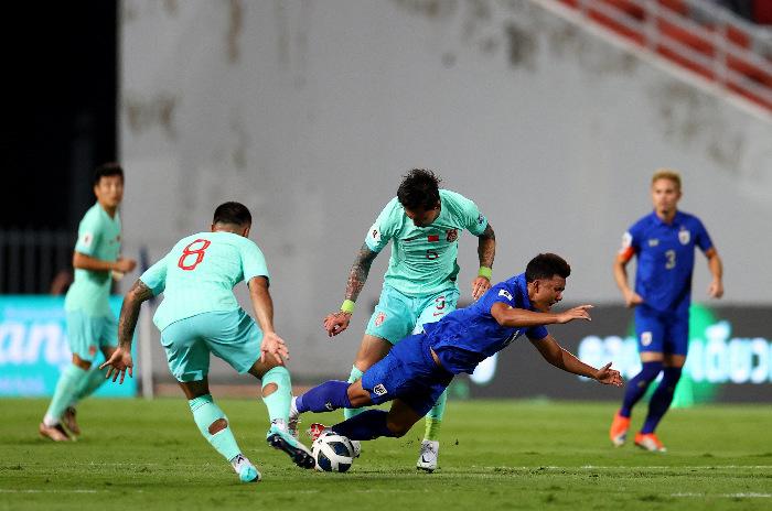 當(dāng)?shù)貢r間11月16日,在世預(yù)賽36強(qiáng)賽C組首輪角逐中,中國男足客場2:1勝泰國隊(duì)。據(jù)悉,中國隊(duì)所在小組的對手是韓國隊(duì)、泰國隊(duì)和新加坡隊(duì),四支球隊(duì)將進(jìn)行主客場循環(huán)賽。圖為中國隊(duì)球員武磊(左)與泰國隊(duì)球員在比賽中。