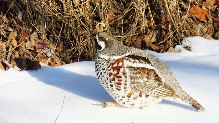 花尾榛雞在雪中覓食。