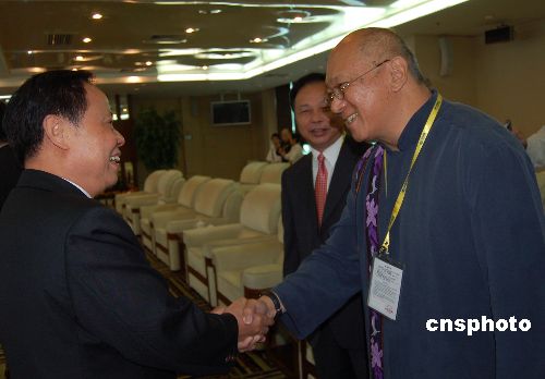 十月二十九日,二〇〇七海外華商相聚中國—東盟博覽會暨廣西商機介紹會在廣西南寧舉行,兩百名華商參加會議,會上簽約十八個項目,金額三點八六億美元。會前廣西壯族自治區(qū)主席陸兵(左)會見出席會議的著名僑領(lǐng)陳嘉庚先生的長孫、新加坡華德私人有限公司董事長陳立人。中新社發(fā) 劉萬強 攝