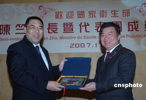 十一月十二日晚,澳門(mén)社會(huì)文化司司長(zhǎng)崔世安在旅游塔宴請(qǐng)國(guó)家衛(wèi)生部代表團(tuán)及本澳醫(yī)療衛(wèi)生團(tuán)體代表,歡迎陳竺部長(zhǎng)率領(lǐng)的國(guó)家衛(wèi)生部代表團(tuán)訪澳。圖為崔世安司長(zhǎng)(左)向陳竺部長(zhǎng)(右)贈(zèng)送禮品。 中新社發(fā) 史利 攝