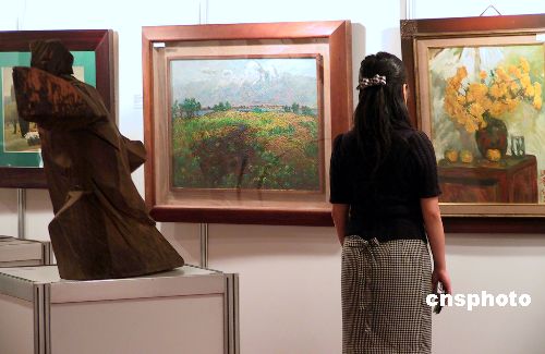十一月十二日,現(xiàn)代中國藝術家張大千、吳冠中、范曾以及臺灣雕塑大師朱銘等人作品在臺北展出,這些作品將出現(xiàn)在本月下旬香港一家藝術品拍賣公司邦瀚斯舉辦的秋季拍賣會上。圖為臺北市民觀摩藝術品。中新社發(fā) 劉舒凌 攝