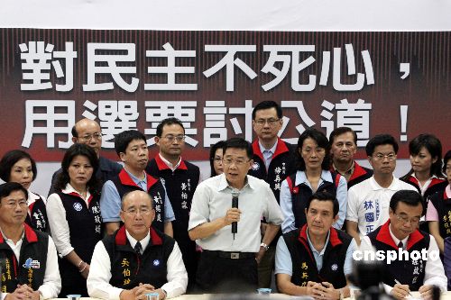 11月16日,高雄市長選舉官司在當(dāng)?shù)囟䦟彾ㄗ。代表中國國民黨的候選人黃俊英(前中)在選舉無效和當(dāng)選無效兩項(xiàng)訴訟中均遭判敗訴。民進(jìn)黨的陳菊在去年12月9日勝出擔(dān)任市長后,今次獲終審保住余下任期。今年6月15日,該官司一審曾判,選舉有效,但陳菊當(dāng)選無效。圖為黃俊英獲知敗訴后,在中國國民黨主席吳伯雄(前左2)和明年大選候選人馬英九(前右2)等陪同下,于競選總部與媒體見面,對(duì)選舉結(jié)果表示失望,并希望擔(dān)任義工幫助同黨候選人贏得今后選舉,以討回公道。中新社發(fā) 黃少華 攝