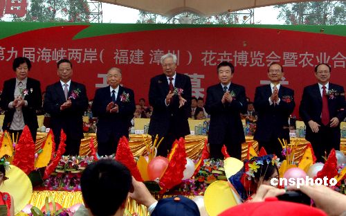 十一月十八日上午,第九屆海峽兩岸(福建漳州)花卉博覽會(huì)暨農(nóng)業(yè)合作洽談會(huì)在福建漳州花博園開(kāi)幕。圖為全國(guó)政協(xié)副主席羅豪才(中)、張克輝(左三),中共福建省委書(shū)記盧展工(右三)、省長(zhǎng)黃小晶(左二),中國(guó)國(guó)民黨副主席林豐正(右二)等兩岸嘉賓出席開(kāi)幕式。中新社發(fā) 王東明 攝