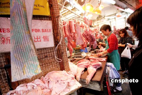12月4日,香港市民如常在街市購買新鮮豬肉。當日,香港豬肉總商會表示,五豐行連續(xù)第3日供港豬肉短缺,令部分肉檔要提早關門。五豐行拍賣的豬肉只是平日的6成半,而活豬的批發(fā)價每擔上升50至80元,但零售肉價維持不變。中新社發(fā) 洪少葵 攝