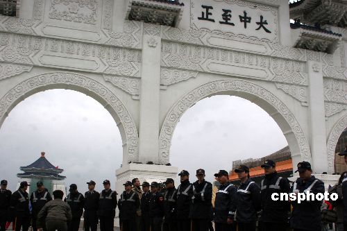 十二月五日,臺北“中正紀念堂”牌樓“大中至正”四字將拆除引發(fā)的風波升級,現(xiàn)場爆發(fā)數(shù)波零星沖突。圖為臺灣當局調來上百名警察嚴陣以待。中新社發(fā) 董會峰 攝