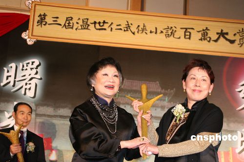 十二月七日,第三屆“溫世仁武俠小說百萬大賞”在臺北揭曉,年僅二十六歲、在北京工作的趙晨光奪得首獎,并獲得一百萬元新臺幣獎金。圖為聯(lián)合報發(fā)行人王效蘭(中)頒發(fā)首獎,由趙晨光的臺灣友人代領(lǐng)。中新社發(fā) 董會峰 攝