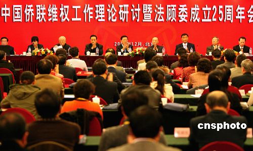 12月8日至9日,中國(guó)僑聯(lián)維權(quán)工作理論研討?hù)呒o(jì)念法顧委成立25周年會(huì)議在北京召開(kāi),會(huì)議表彰了近五年來(lái)各地僑聯(lián)維權(quán)工作先進(jìn)單位和個(gè)人。會(huì)議就建立維權(quán)長(zhǎng)效機(jī)制,切實(shí)維護(hù)歸僑僑眷和海外僑胞在國(guó)內(nèi)的合法權(quán)利和利益進(jìn)行理論研討。中國(guó)僑聯(lián)法顧委是1982年5月6日成立的中國(guó)僑聯(lián)高層法律服務(wù)顧問(wèn)機(jī)構(gòu)。中新社發(fā) 張勤 攝