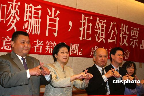 十二月十日,臺灣民間團體“民主行動聯(lián)盟”在臺北舉行記者會,宣布由十多位學(xué)者、名嘴組成“入、返聯(lián)公投”反方意見辯論團。“民主行動聯(lián)盟”總召集人黃光國教授(左三)并呼吁民眾,為了擺脫民粹政治、不激化兩岸關(guān)系,拒領(lǐng)“入、返聯(lián)公投”票。中新社發(fā) 董會峰 攝