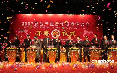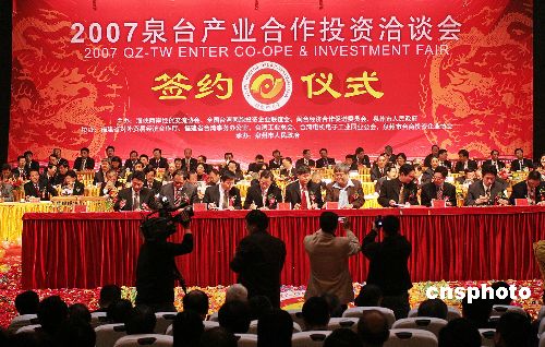 十二月十一日,“二00七泉臺(tái)產(chǎn)業(yè)合作投資洽談會(huì)”在僑鄉(xiāng)福建泉州開幕,商務(wù)部、國(guó)臺(tái)辦有關(guān)官員及臺(tái)灣島內(nèi)各界知名人士、在大陸臺(tái)商等千余嘉賓參加。本屆“產(chǎn)洽會(huì)”突出“產(chǎn)業(yè)合作、共謀雙贏”主題,集推介、論壇、洽談、簽約、考察為一體,旨在打造新的臺(tái)商投資聚集區(qū)。中新社發(fā) 傅丹丹 攝
