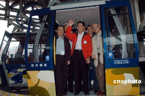 12月22日,香港商務(wù)及經(jīng)濟(jì)發(fā)展局局長(zhǎng)馬時(shí)亨(中)早上試坐昂坪360纜車,馬贊賞纜車有改善,又說(shuō)坐得很放心,呼吁市民及游客都應(yīng)該來(lái)坐纜車。中新社發(fā) 譚達(dá)明 攝