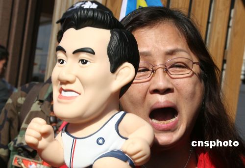 十二月二十八日,前臺北市長馬英九特別費(fèi)案二審宣判無罪。圖為一位支持者手持馬英九玩偶,高呼“馬英九無罪”等口號。中新社發(fā) 董會峰 攝