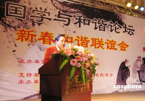 一月十一日,世界華人聯(lián)合總會會長賀興桐,在廣西北海市召開的全球華商“國學與和諧論壇暨新春和諧聯(lián)誼會”上致辭。當日,來自海內(nèi)外五百余名華人華商匯聚該論壇,縱論“國學與和諧”,共商廣西北部灣經(jīng)濟區(qū)及中國西部地區(qū)的創(chuàng)業(yè)大計。中新社發(fā) 馮抒敏 攝