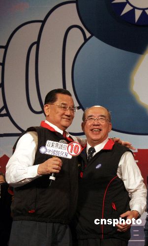 中國(guó)國(guó)民黨榮譽(yù)主席連戰(zhàn)(左)與國(guó)民黨主席吳伯雄共同為國(guó)民黨參選“立委”打氣、助威。