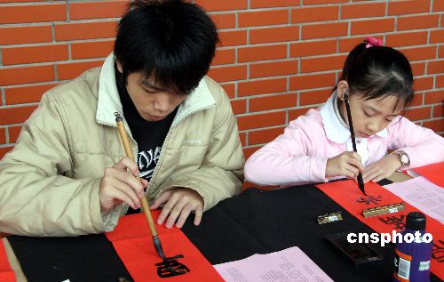 圖為兩位青少年書法愛(ài)好者正在寫春聯(lián)。