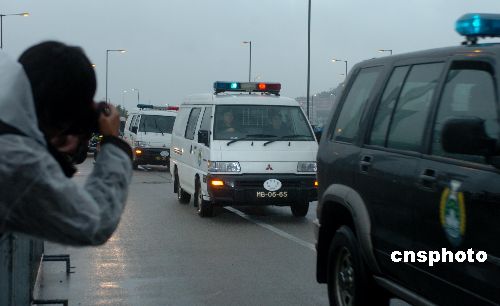 押解歐文龍的囚車(白色)在警車的護衛(wèi)下駛?cè)氚拈T終審法院。
