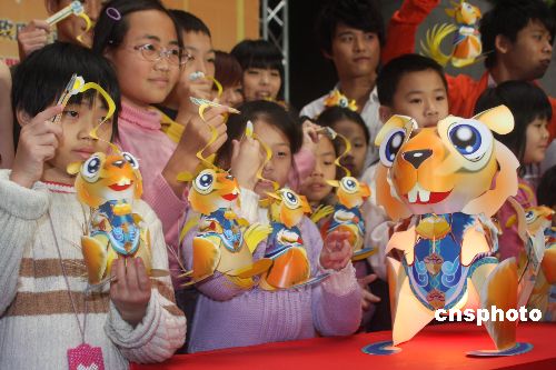 臺北市將從2月15日起舉辦為期十天的“囍迎曙光耀繁城”盛大燈節(jié),臺北市政府還將向市民發(fā)放十萬盞由臺灣著名紙雕藝術家洪新富創(chuàng)作的“豐足鼠”小提燈。1月31日,首批臺北學童領到了“豐足鼠”小提燈。中新社發(fā) 耿軍 攝