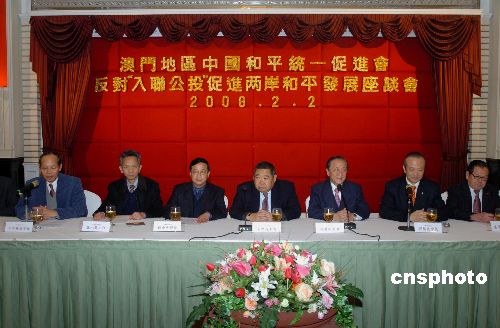 二月二日,澳門(mén)地區(qū)中國(guó)和平統(tǒng)一促進(jìn)會(huì)在萬(wàn)豪軒酒店舉行“反對(duì)‘入聯(lián)公投’,促進(jìn)兩岸和平發(fā)展”座談會(huì)。專(zhuān)程來(lái)澳門(mén)的臺(tái)灣新黨主席郁慕明主講了“兩岸關(guān)系發(fā)展的形式和前景”,與會(huì)各界人士也紛紛表達(dá)了反對(duì)“入聯(lián)公投”,促進(jìn)兩岸和平發(fā)展的心聲。中新社發(fā) 史利 攝