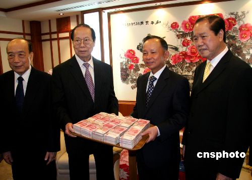 二月四日,曼谷,泰國(guó)中華總商會(huì)向中國(guó)雪災(zāi)災(zāi)區(qū)人民捐款現(xiàn)金五十萬(wàn)元人民幣。中國(guó)部分地區(qū)近來遭到嚴(yán)重雪災(zāi)的消息牽動(dòng)無(wú)數(shù)泰國(guó)華僑華人的心,泰國(guó)多個(gè)華人社團(tuán)、公司及個(gè)人,四日紛紛前往中國(guó)駐泰國(guó)大使館向?yàn)?zāi)區(qū)捐款救災(zāi)。泰國(guó)正大集團(tuán)、中華總商會(huì)、九屬會(huì)館、泰國(guó)進(jìn)出口商會(huì)、泰國(guó)各姓氏宗親總會(huì)聯(lián)合會(huì)、泰國(guó)報(bào)德善堂等華人公司和社團(tuán)的領(lǐng)導(dǎo)人,向中國(guó)駐泰大使張九桓(右二)轉(zhuǎn)交總計(jì)二百六十萬(wàn)元人民幣和二百萬(wàn)泰銖捐款。中新社發(fā) 顧時(shí)宏 攝