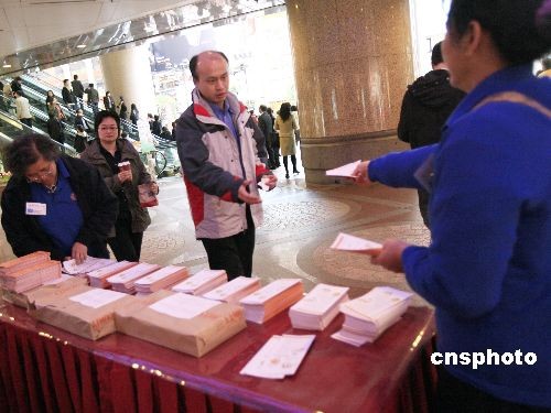 二月二十七日,香港財(cái)政司司長(zhǎng)曾俊華向立法會(huì)提交二零零八至零九年度財(cái)政預(yù)算案,公布政府綜合盈余達(dá)一千一百五十六億元,創(chuàng)歷來(lái)新高,并推出多項(xiàng)減稅和惠及社會(huì)的措施。圖為有關(guān)組織街頭派發(fā)財(cái)政預(yù)算案摘要小冊(cè)子給市民。中新社發(fā) 王麗南 攝