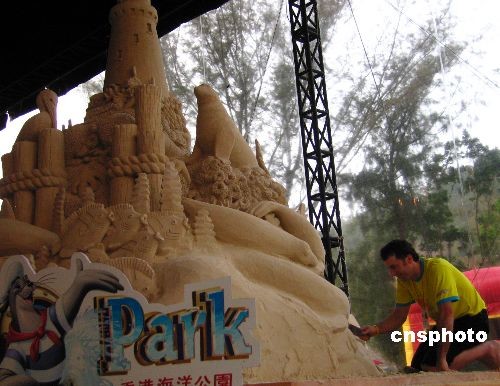 香港海洋公園將于三月二十一日至四月二十日推出“高清動物月”,并將舉辦香港首個大型沙雕展覽,吉尼斯最高及最長沙雕藝術(shù)品的紀錄保持者Ted Siebert及其隊友將以二百噸沙進行創(chuàng)作。圖為十八日,一位藝術(shù)家正在進行沙雕創(chuàng)作。中新社發(fā) 陳伊敏 攝
