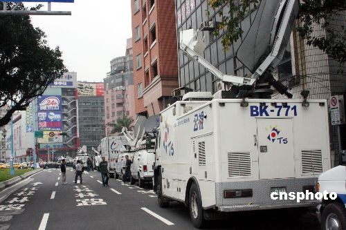二00八臺灣地區(qū)領(lǐng)導(dǎo)人選舉投票三月二十二日上午八點開始,中國國民黨候選人馬英九、蕭萬長競選總部外,大批電視直播車云集,隨時做連線報道。中新社發(fā) 黃少華 攝