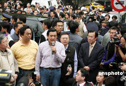 三月二十二日,二00八臺灣地區(qū)領(lǐng)導(dǎo)人選舉投票。中國國民黨候選人馬英九在臺北一個投開票所投票后,接受眾多媒體的采訪。中新社發(fā) 黃少華 攝