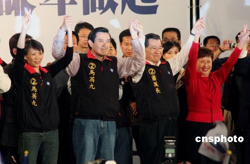 3月22日,中國(guó)國(guó)民黨候選人馬英九、蕭萬(wàn)長(zhǎng)在臺(tái)灣地區(qū)領(lǐng)導(dǎo)人大選中以221萬(wàn)票的領(lǐng)先優(yōu)勢(shì)獲勝。當(dāng)日晚間,馬英九夫婦和蕭萬(wàn)長(zhǎng)夫婦在競(jìng)選總部前的集會(huì)上,與支持者共同慶祝勝選。中新社發(fā) 黃少華 攝