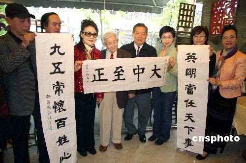 四月一日,臺(tái)灣知名書法家楊家麟(左四)在其八十八歲“生日文化小聚”上,現(xiàn)場(chǎng)書寫自己創(chuàng)作的對(duì)聯(lián)贈(zèng)送馬英九,希望他常懷百姓之心,把臺(tái)灣經(jīng)濟(jì)搞好。左五為馬英九、蕭萬長(zhǎng)派來的代表林先生。中新社發(fā) 董會(huì)峰 攝