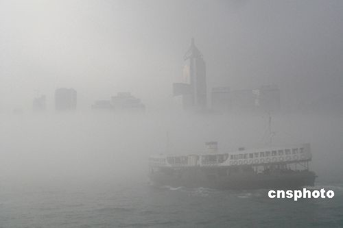 四月六日,香港清晨部分海域能見(jiàn)度低于兩海里,蒲臺(tái)島海域今早約六時(shí)發(fā)生兩艘貨船相撞意外,其中一艘貨船船尾被撞穿入水,事件中無(wú)人受傷。國(guó)泰航空早上一班由臺(tái)北來(lái)港的航機(jī)轉(zhuǎn)飛廣州,傍晚才起飛來(lái)港。另有一些離島至港島的渡船停開(kāi)。圖為上午維港掩映在飄渺的白霧中。 中新社發(fā) 陳京松 攝