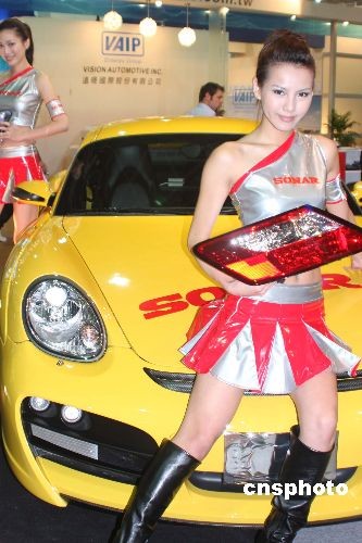 4月9日,“臺北國際汽車零配件展覽會”在新落成的臺北南港展覽館開幕。圖為一個參展攤位的香車美女。中新社發(fā) 董會峰 攝