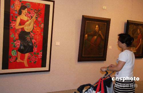 4月16日,“侯佩芩2008油畫(huà)個(gè)展”在臺(tái)北縣政府西側(cè)藝?yán)鹊菆?chǎng),不過(guò)此侯佩芩非臺(tái)灣名主播,而是臺(tái)灣藝術(shù)大學(xué)四年級(jí)學(xué)生。圖為一名婦女推著嬰兒車(chē)在欣賞《少女之夢(mèng)》,此畫(huà)作中的女子容貌頗像其作者侯佩芩。中新社發(fā) 董會(huì)峰 攝