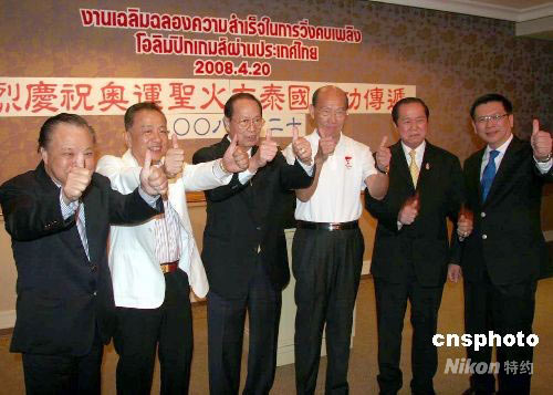 參加奧運圣火在曼谷傳遞的八十名華人火炬手二十日晚歡聚一堂,舉杯共慶奧運火炬在泰國成功傳遞。作為參加曼谷火炬?zhèn)鬟f第一棒的泰國中華總商會主席吳宏豐(左三)在慶祝晚會上說,奧運會已經(jīng)舉辦二十八屆,但奧運圣火卻是第一次蒞臨泰國。在泰國的八十名火炬手中,有五十位是華僑華人。我們有幸加入傳遞奧運圣火的行列,昂首闊步,豪情滿懷,親身感受民族尊嚴和奧運熱度,傾聽數(shù)十萬人震耳欲聾的吶喊,見證群情振奮迎圣火的激情場面,非常興奮和自豪。 中新社發(fā) 顧時宏 攝