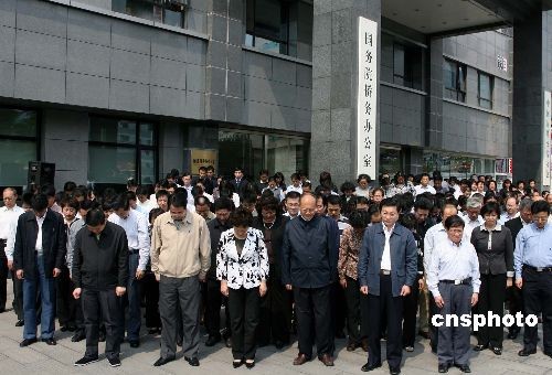 5月19日,國(guó)務(wù)院僑務(wù)辦公室全體機(jī)關(guān)干部為四川汶川大地震罹難同胞默哀。2008年5月19日至21日為全國(guó)哀悼日。中新社發(fā) 張勤 攝