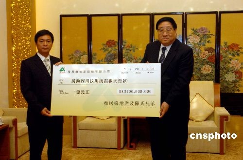 五月二十日,雅居樂地產有限公司通過中聯(lián)辦向四川地震災區(qū)捐款一億港元。圖為集團主席陳卓南與中聯(lián)辦主任高祀仁(右)出席捐款儀式。中新社發(fā) 鄧慶樂 攝