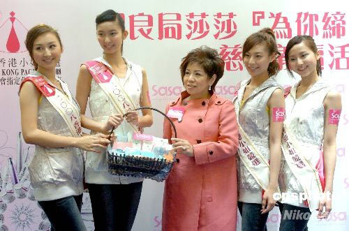 六月二十日,二零零八年香港小姐十二位候選佳麗,在香港出席保良局與莎莎化妝品公司合辦的“為你締造美麗人生”慈善義賣活動(dòng)。同場一至四號(hào)候選佳麗文柏姿、倫紫玄、張舒雅、高海寧(右起)獲頒“最具智慧佳麗”獎(jiǎng)項(xiàng),由莎莎化妝品有限公司副主席郭羅桂珍頒贈(zèng)獎(jiǎng)品。中新社發(fā) 鄧慶樂 攝