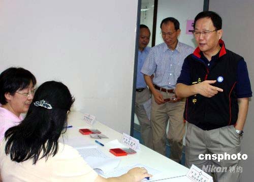 7月26日,中國國民黨舉行中常委選舉投、開票。國民黨籍“立法委員”丁守中(右),第一個來到位于臺北市議會的投票所登記參加投票。中新社發(fā) 董會峰 攝