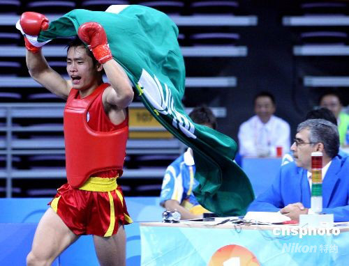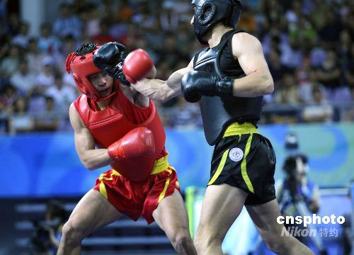 8月24日,在北京2008武術(shù)比賽男子70公斤級(jí)散手決賽中,中國(guó)澳門選手蔡良蟬(紅方)戰(zhàn)勝俄羅斯選手穆拉德·阿哈多夫,獲得冠軍。當(dāng)日,北京2008武術(shù)比賽落下帷幕。中新社發(fā) 宋吉河 攝