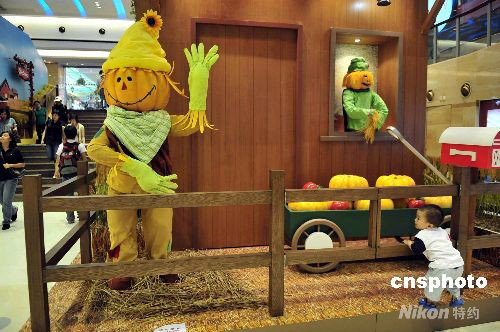 九月十日,雖然尚有一個多月才到萬圣節(jié),香港一商場已布置不少鬼怪造型,引來市民注目或拍照。中新社發(fā) 譚達(dá)明 攝