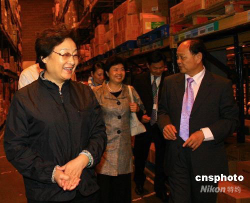 當(dāng)?shù)貢r(shí)間11日下午,抵英訪問(wèn)的中國(guó)國(guó)務(wù)院僑辦主任李海峰前往當(dāng)?shù)厝A商企業(yè)“泗和行”,現(xiàn)場(chǎng)了解其經(jīng)營(yíng)與發(fā)展?fàn)顩r。圖為李海峰(左)在泗和行老板謝貴全(右)的陪同下,參觀其現(xiàn)代化倉(cāng)儲(chǔ)基地。中新社發(fā) 李鵬 攝