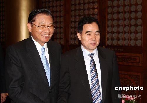 9月19日,臺灣海基會董事長江丙坤在臺北圓山飯店,會見率團(tuán)前來臺灣參加海峽兩岸出版交流二十周年紀(jì)念活動的部分大陸代表團(tuán)成員時(shí),與新聞出版署署長柳斌杰(右)在一起。中新社發(fā) 陳立宇 攝