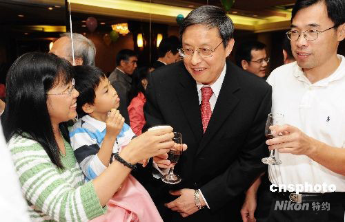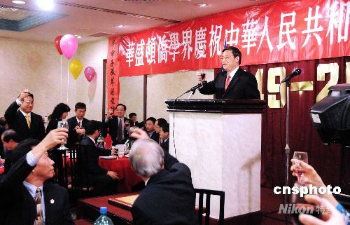當?shù)貢r間9月21日晚,中國駐美大使周文重(講臺上)、公使劉光源(左一)夫婦、公使謝鋒夫人、總領事吳冬梅等參加當?shù)貎S學界慶祝中華人民共和國成立五十九周年晚會。周文重在晚會上致詞說,建國以來尤其是改革開放30年來,中國建設成就輝煌,2008年的中國經(jīng)受了各種嚴峻的考驗,兩岸關系出現(xiàn)了新的轉(zhuǎn)機,中華民族復興正面臨難得的歷史機遇。中新社發(fā) 邱江波 攝