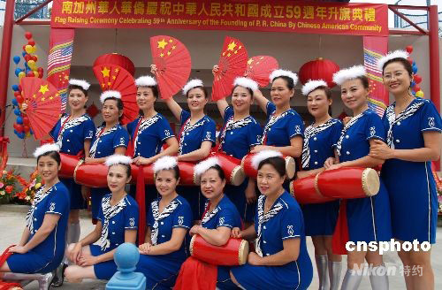 當(dāng)?shù)貢r間9月21日上午,美國南加州華人華僑慶祝中華人民共和國成立59周年“十一”國慶升旗典禮儀式在洛杉磯巴恩斯公園隆重舉行,活躍在美國主流社區(qū)的“洛杉磯第一腰鼓隊”在中國國慶升旗典禮上亮相。 中新社發(fā) 盧威 攝